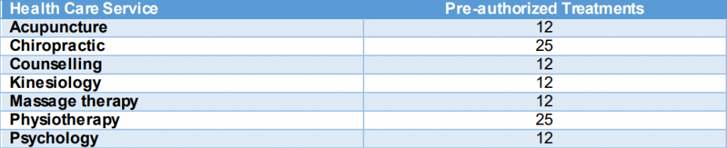 As of April 1, 2022, the fee schedule for health care providers providing treatment to injured ICBC customers will see a nominal increase compared to the previous year. Those who are injured in a motor vehicle accident and have a valid claim are preauthorized for the following number of treatments for each health care service within the first twelve weeks after their accident date.